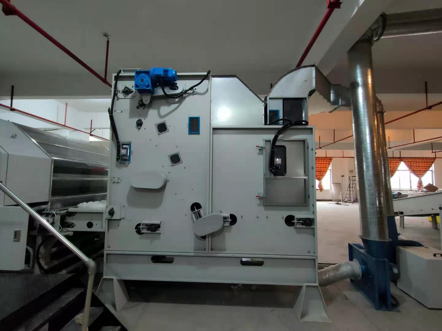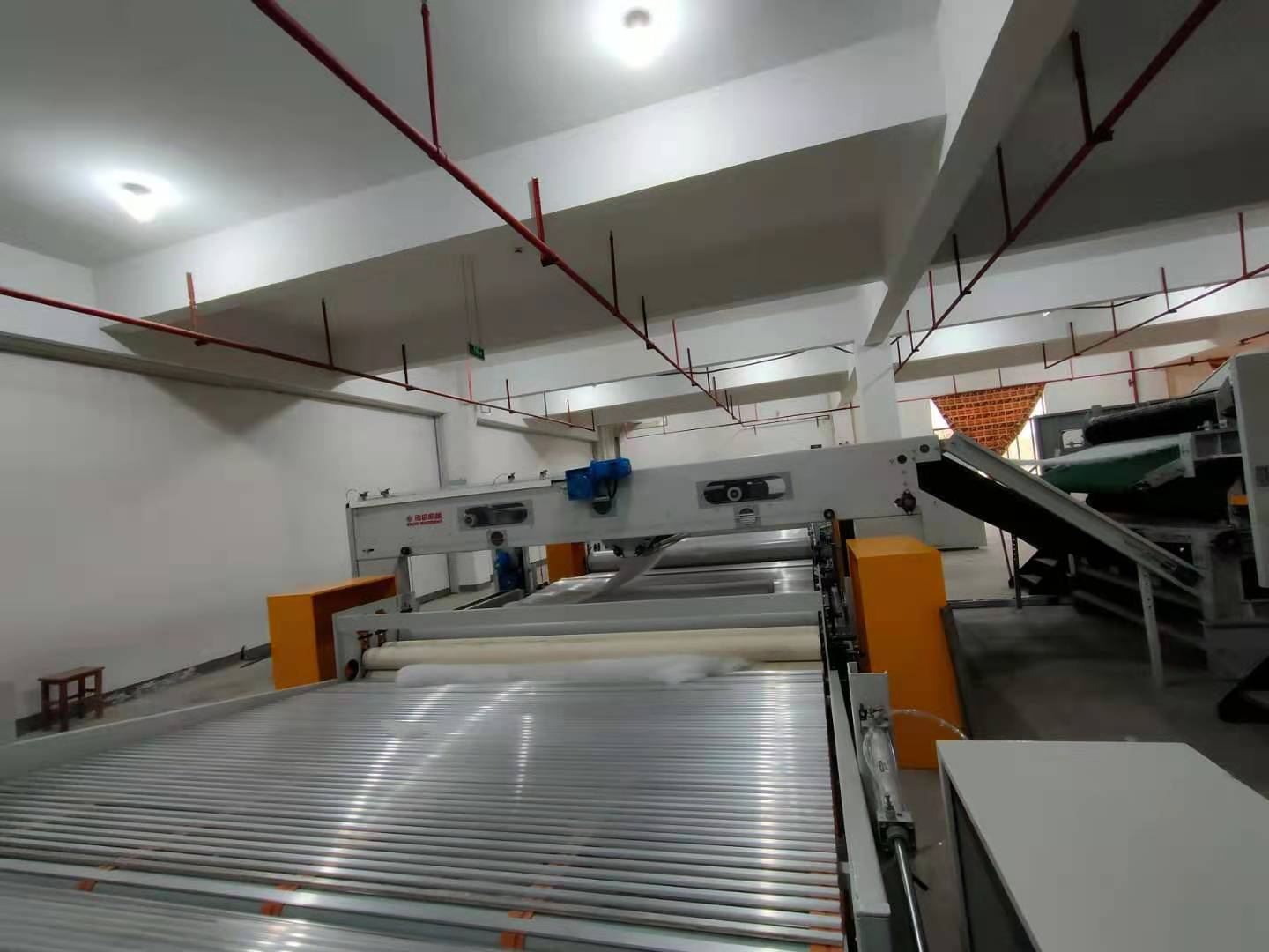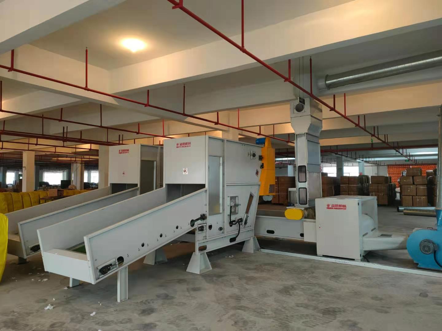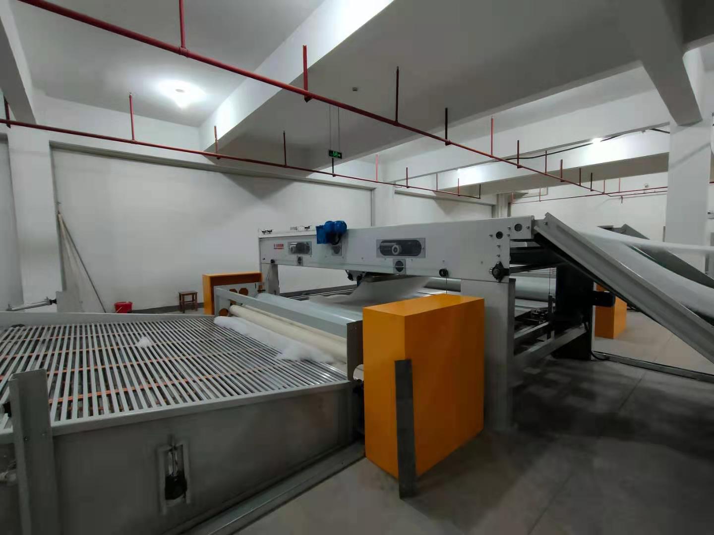 本生產(chǎn)線專(zhuān)為化纖填充被套的自動(dòng)化生產(chǎn)設(shè)計(jì),涵蓋從纖維梳理、填充物鋪網(wǎng)到被套封裝的全流程,具有高效、精準(zhǔn)、衛(wèi)生等特點(diǎn),適用于家紡、酒店用品、醫(yī)療寢具等領(lǐng)域的大規(guī)模生產(chǎn)。 化纖原料預(yù)處理 原料開(kāi)松:將壓縮的化纖塊(如滌綸、PP棉等)通過(guò)開(kāi)松機(jī)打散,形成蓬松狀態(tài)。 纖維梳理:通過(guò)高速梳理機(jī)將纖維梳理成均勻的網(wǎng)狀結(jié)構(gòu),確保填充物無(wú)結(jié)塊、厚度一致。 填充物鋪網(wǎng)與定型 交叉鋪網(wǎng)機(jī)將梳理后的纖維多層疊加,調(diào)節(jié)克重和蓬松度。 短程熱風(fēng)定型(可選):通過(guò)低溫?zé)犸L(fēng)穩(wěn)定纖維結(jié)構(gòu),增強(qiáng)回彈性。 被套裝配與封裝 自動(dòng)裁切:按預(yù)設(shè)尺寸切割填充層,匹配被套外殼。 充填裝套:通過(guò)充填機(jī)將纖維層均勻填入預(yù)制的被套外殼,避免分布不均。 絎縫/封口:采用多針絎縫機(jī)固定填充物,或通過(guò)超聲波封口機(jī)完成密封(防螨抗菌需求場(chǎng)景)。 質(zhì)檢與包裝 重量檢測(cè):確保每床被子填充量符合標(biāo)準(zhǔn)。 金屬探測(cè):排除生產(chǎn)過(guò)程中可能的金屬雜質(zhì)。 自動(dòng)折疊包裝:真空壓縮(可選)后裝箱。 高效率:全自動(dòng)化流程,日產(chǎn)量可達(dá)2000~5000床(視規(guī)格而定)。 精準(zhǔn)控制:PLC系統(tǒng)調(diào)節(jié)填充量、絎縫間距等參數(shù),誤差≤2%。 衛(wèi)生環(huán)保:封閉式填充環(huán)節(jié)減少粉塵污染,支持可回收化纖材料。 靈活適配:可快速切換不同被套尺寸(單人/雙人/加大)和填充克重。 智能分揀系統(tǒng):聯(lián)動(dòng)MES系統(tǒng)實(shí)現(xiàn)訂單批次管理。 抗菌處理模塊:在線噴涂抗菌劑(適用于醫(yī)療、兒童用品)。生產(chǎn)線概述